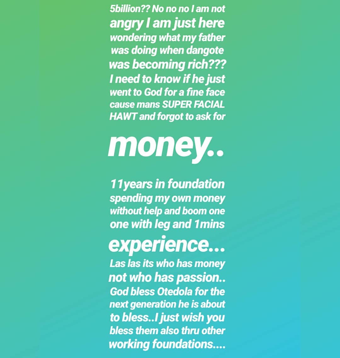 "5billion!!! No no no I am not angry I am just here wondering what my father was doing when Dangote was getting richer??? I need to know if he just went to God for a fine face cause man is super facial hawt and forgot to ask for money...11 years in foundation spending my own money without help and boom one one with 1 min experience...las las its who has money not who has passion. God bless Otedola for the next generation he is about to bless... I just wish you bless them thru other working foundations," she wrote.