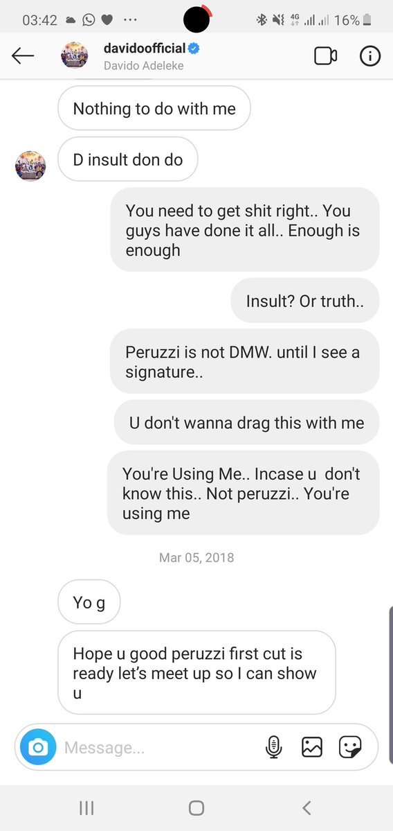 "@Davido knew peruzzi was signed to Goldenboy yet he went ahead to "Audio Sign" Peruzzi without following due process. I reached out to him, look what a so called boss had to say in my dm. Fact: @Peruzzi_VIBES is not Signed to DMW. "