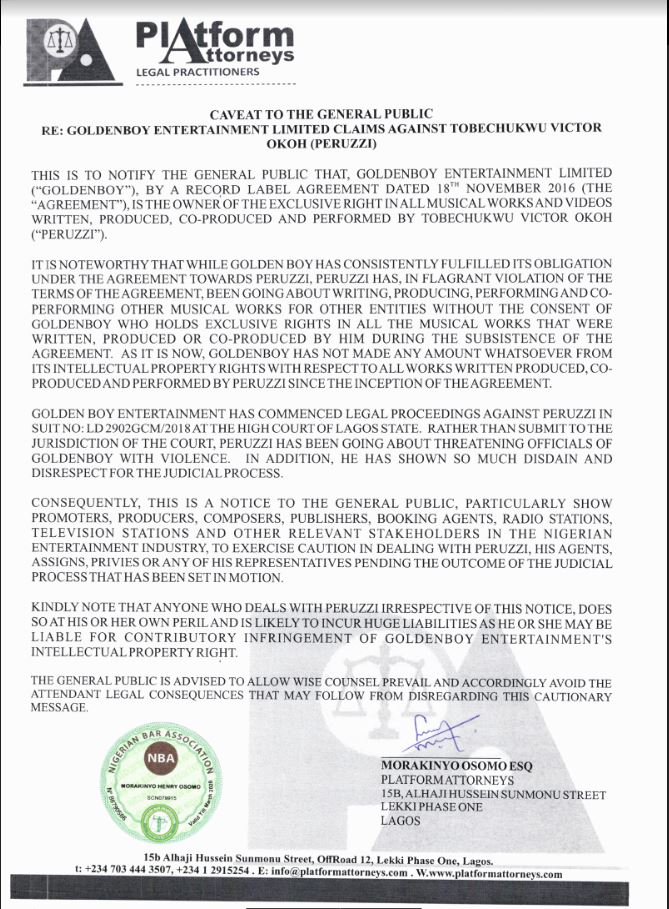 On November 18, 2019, Pulse then obtained a caveat from one Morakinyo Henry Osomo of Platform Attorneys. He claimed to be a legal representative of Patrick Ayaene. The caveat sought to restrain members of the public from dealing with Peruzzi, named by his actual name, Tobechukwu Victor Okoh.