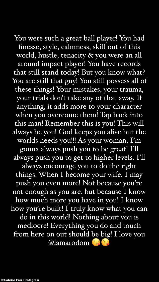 "When I become your wife, I may push you even more! Not because you aren't enough as you are, but because I know how much more you have in you. I know how you're built! I truly know what you can do in this world! Nothing about you is mediocre. Everything you do and touch from here on out should be big! I love you @lamarodom."