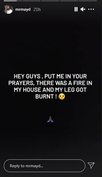 "Hey Guys, please put me in your prayers. There was a fire incident in my house and my legs got burnt," he wrote.