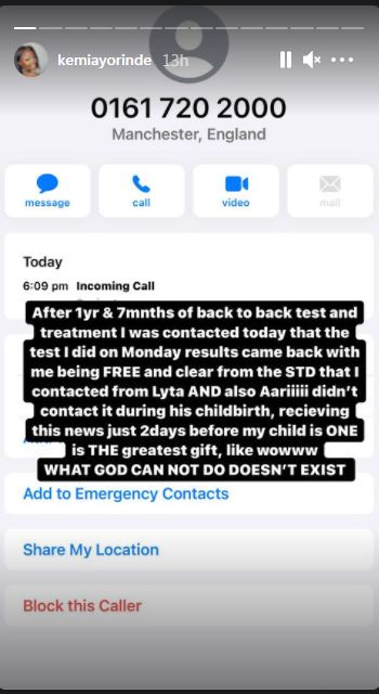 Nigerian singer Lyta's baby mama Kemi Ayorinda has revealed that she's free from the Sexually Transmitted Disease she contracted from him.