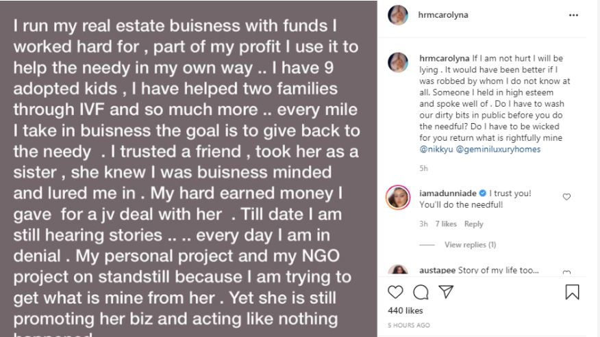 According to the movie star in a now-deleted post shared via her Instagram page, she was allegedly lured into a business deal by Ufondu.