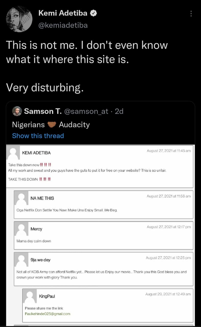 Kemi Adetiba denies commenting on site illegally circulating 'KOB' series