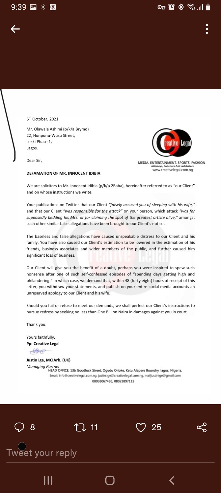 The letter gave Brymo 48 hours to tender an unreserved apology to 2Face Idibia and his family on all his social media pages.