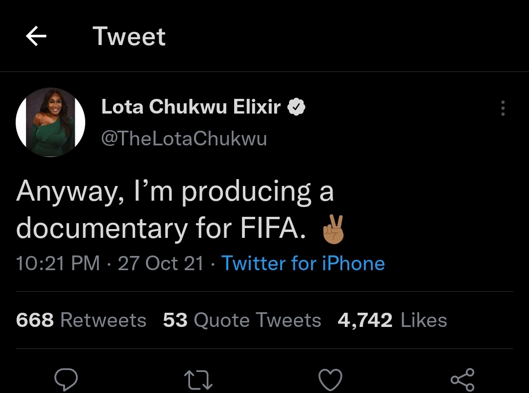Chukwu made the announcement via a tweet shared on Wednesday, October 27. She wrote: "Anyway, I’m producing a documentary for FIFA."