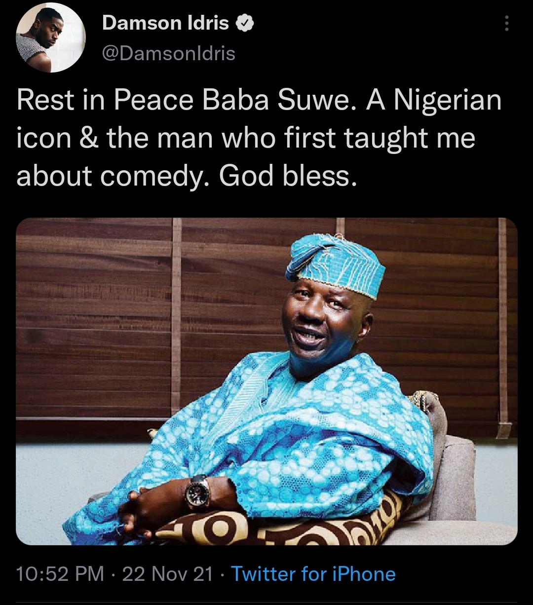 “Rest in Peace Baba Suwe. A Nigerian icon and the man first taught me about comedy. God bless,” Idris tweeted.