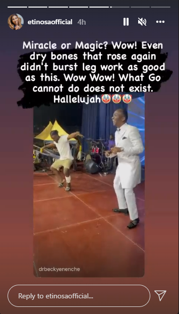 Nollywood actress Etinosa Idemudia has reacted to a video of popular Abuja pastor, Paul Eneche performing a miracle.