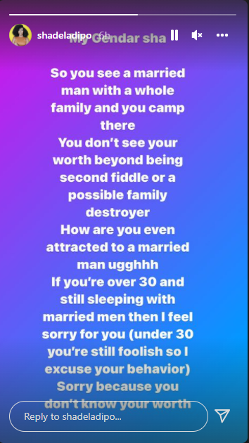 In a post shared via her Instagram Stories on Monday, January 24, 2022, Ladipo questioned the movie star's decision to date a married man.