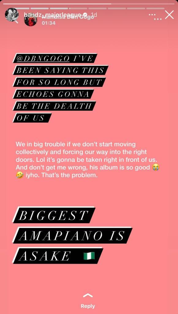 Bandz of Major League calls Asake Biggest Ampiano of the Year: While reposting DBN's post, Bandz of the famous South African DJ group Major League also shared his concerns.
