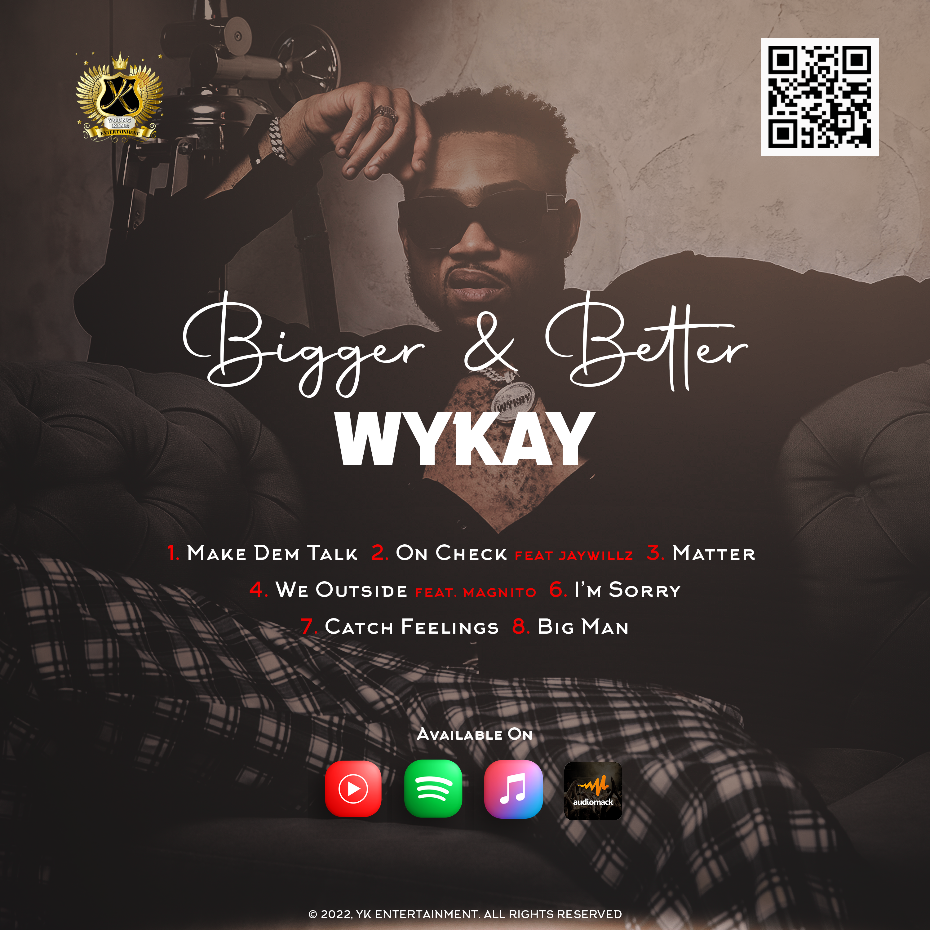 ‘Bigger & Better’ is a nearly gapless immersion into Wykay’s potent and homeland signature sound and comprises seven (7) tracks which infuses the latest afro-pop sounds that would excite its listeners. The first track in the EP, ‘Make dem Talk’, describes the rapper as a daring lion who is touting his perceived enemies.
