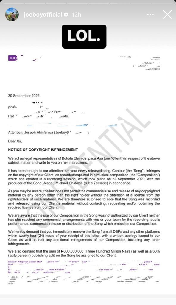According to the letter, the Lawyers representing Asa stated that the song's composition was created by Asa in a recording session with Tempoe which took place on 22nd, September 2020. It further stated their client didn't grant permission for Joeboy and Tempoe to utilize said composition.