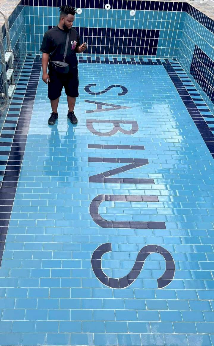 Taking to Instagram page, the AMVCA-winning creator showed off the house's pool, which has his name engraved in it.