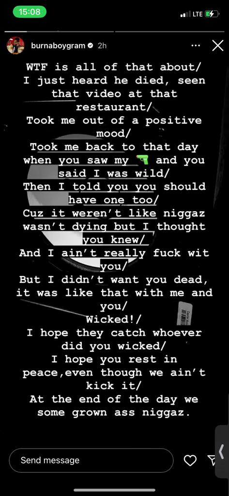 Burna Boy described the news as shocking and sad as it took him out of a positive mood. Burna Boy went further to say that while he wasn't cordial with AKA, he never wanted him dead.