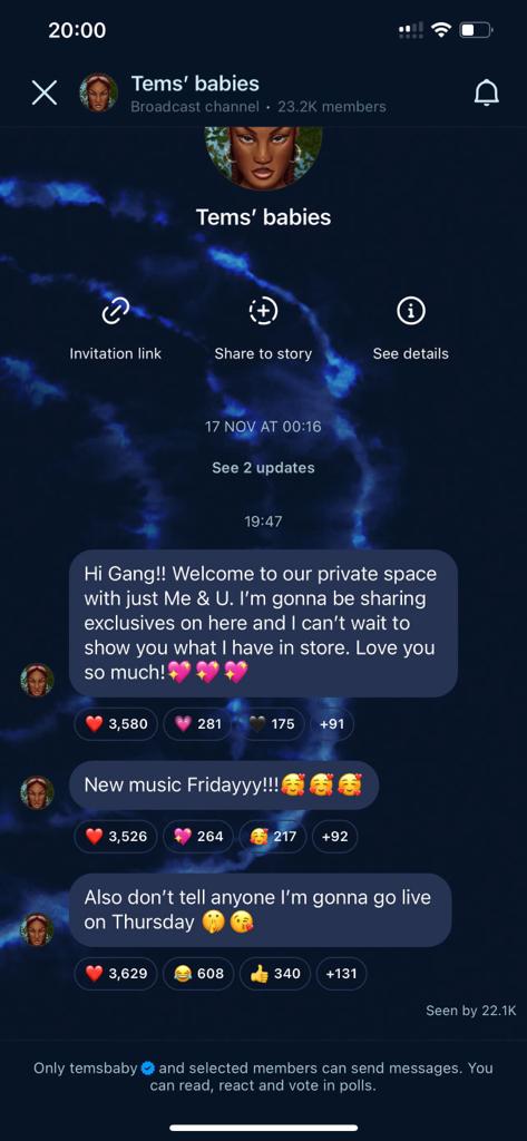 The Instagram channel garnered over 23,000 members just a few minutes after Tems opened it. In her first message to her fans, Tems informed them that the channel will serve as a medium for exclusive news. She also stated that she can't wait to tell them what she has in store for them with her upcoming single being the first.